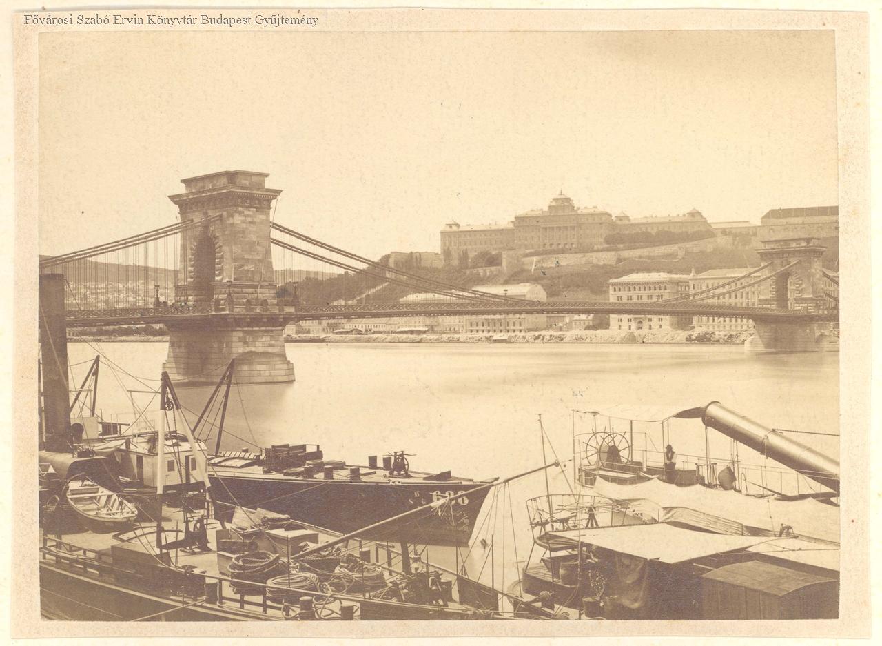 A budai oldalon még kiépítetlen rakpart. Az előtérben a fedélzeten kötelek, hordók, ládák