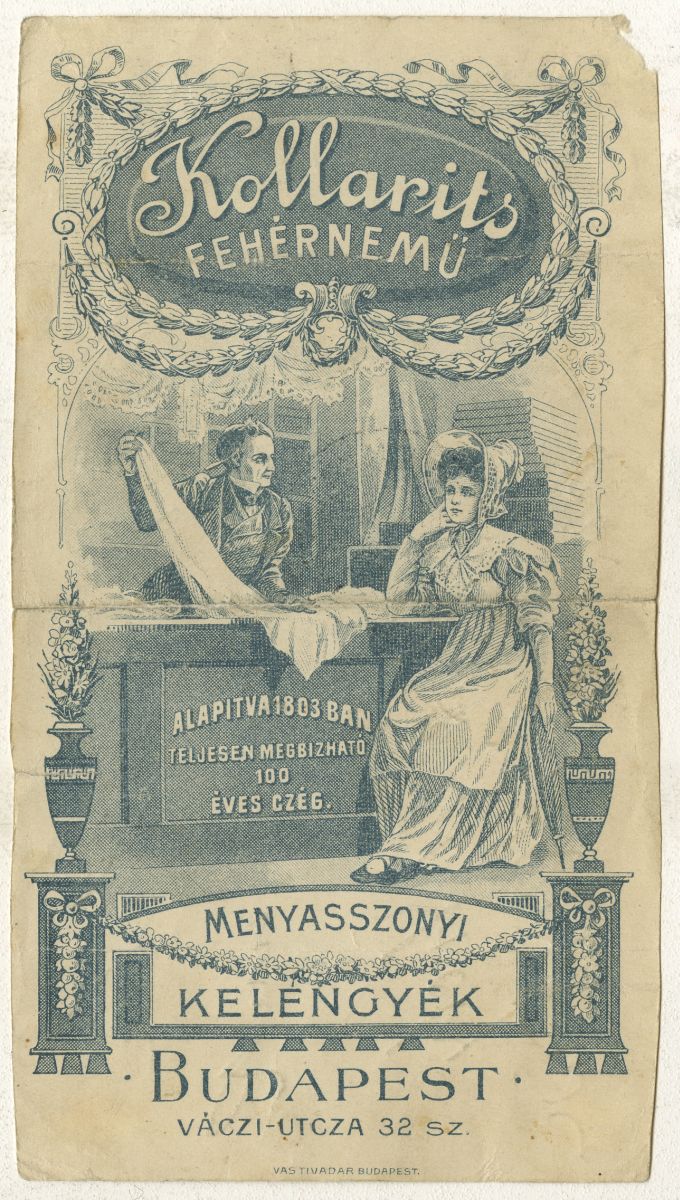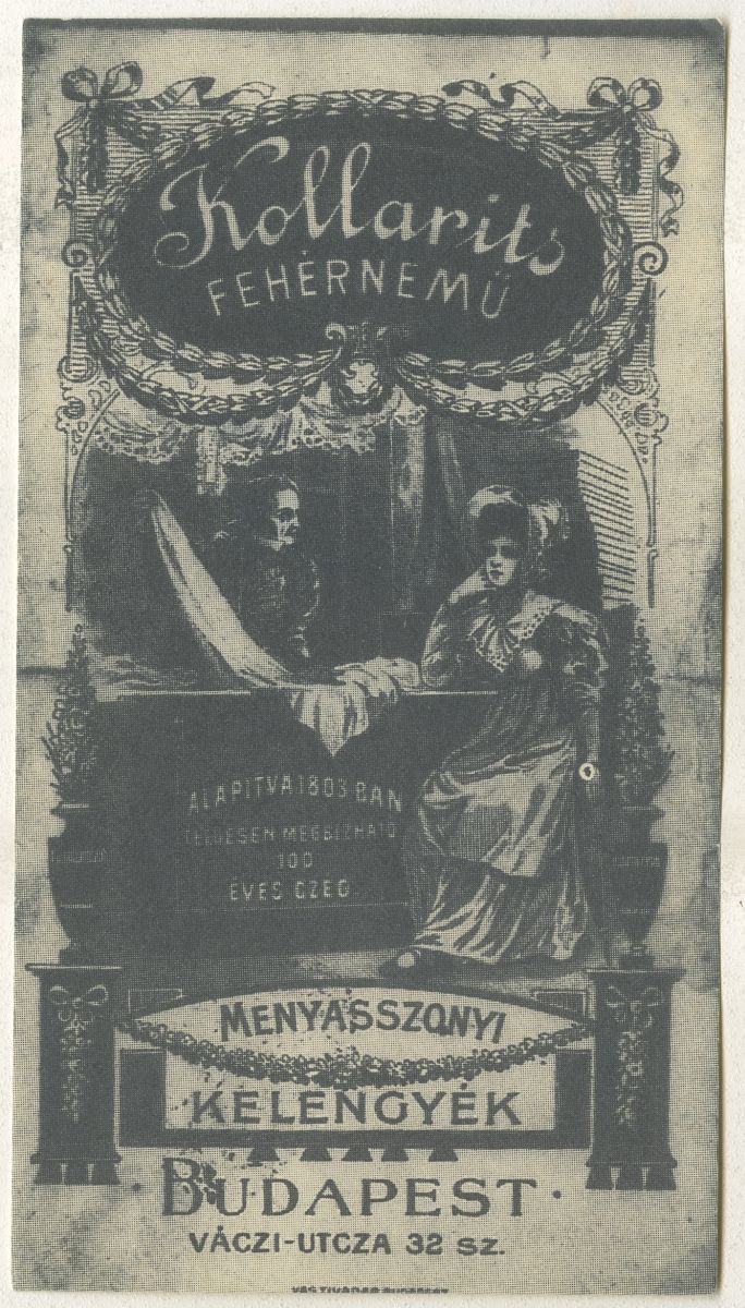 A hirdetés szövege: Kollarits fehérnemű Alapítva 1803- ban. Teljesen megbízható 100 éves cég. Menyasszonyi kelengyék Budapest Váci utca 32. sz.