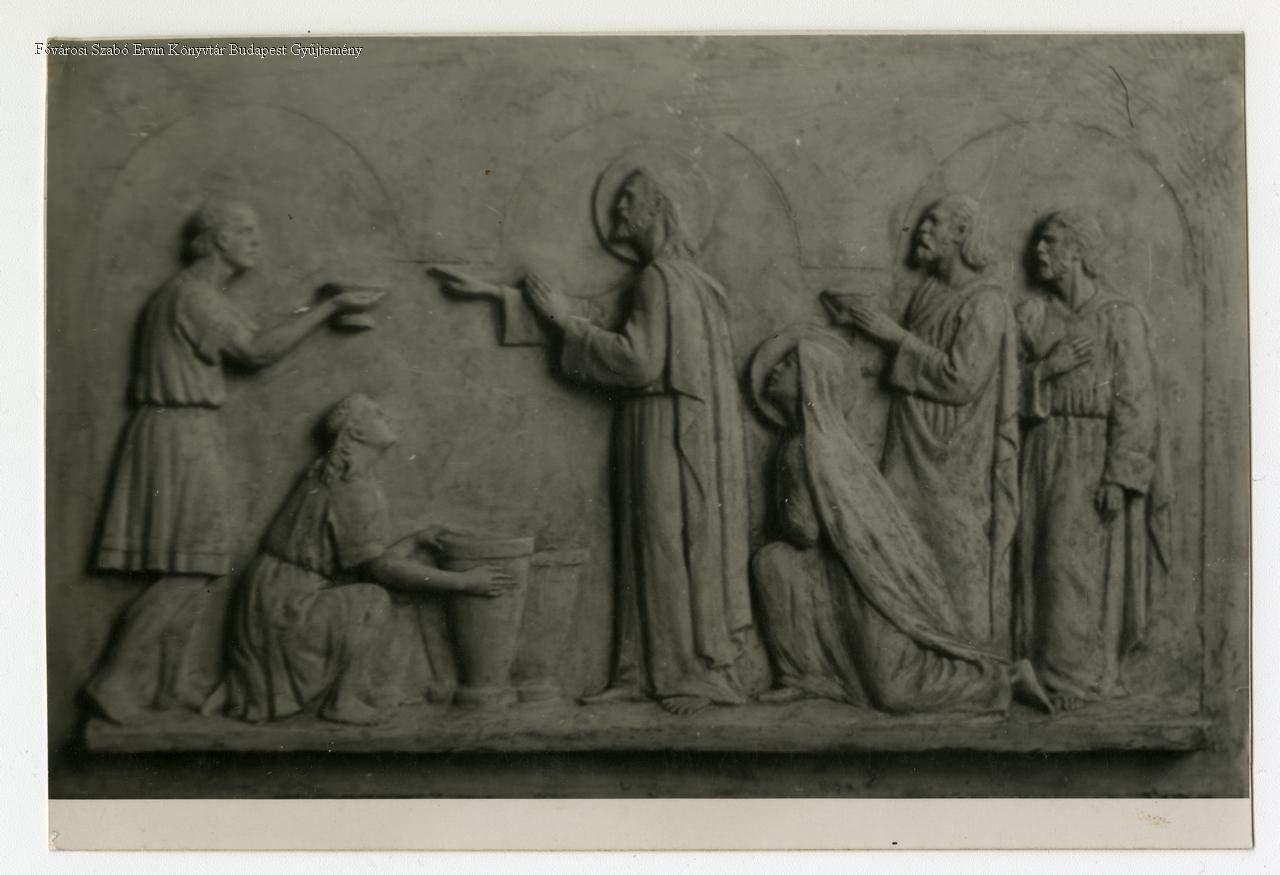 [Kánaáni mennyegző, Krisztus borrá változtatja a vizet] [Dombormű a Kassai téri templomban, Zsákodi Csiszér János alkotása]
