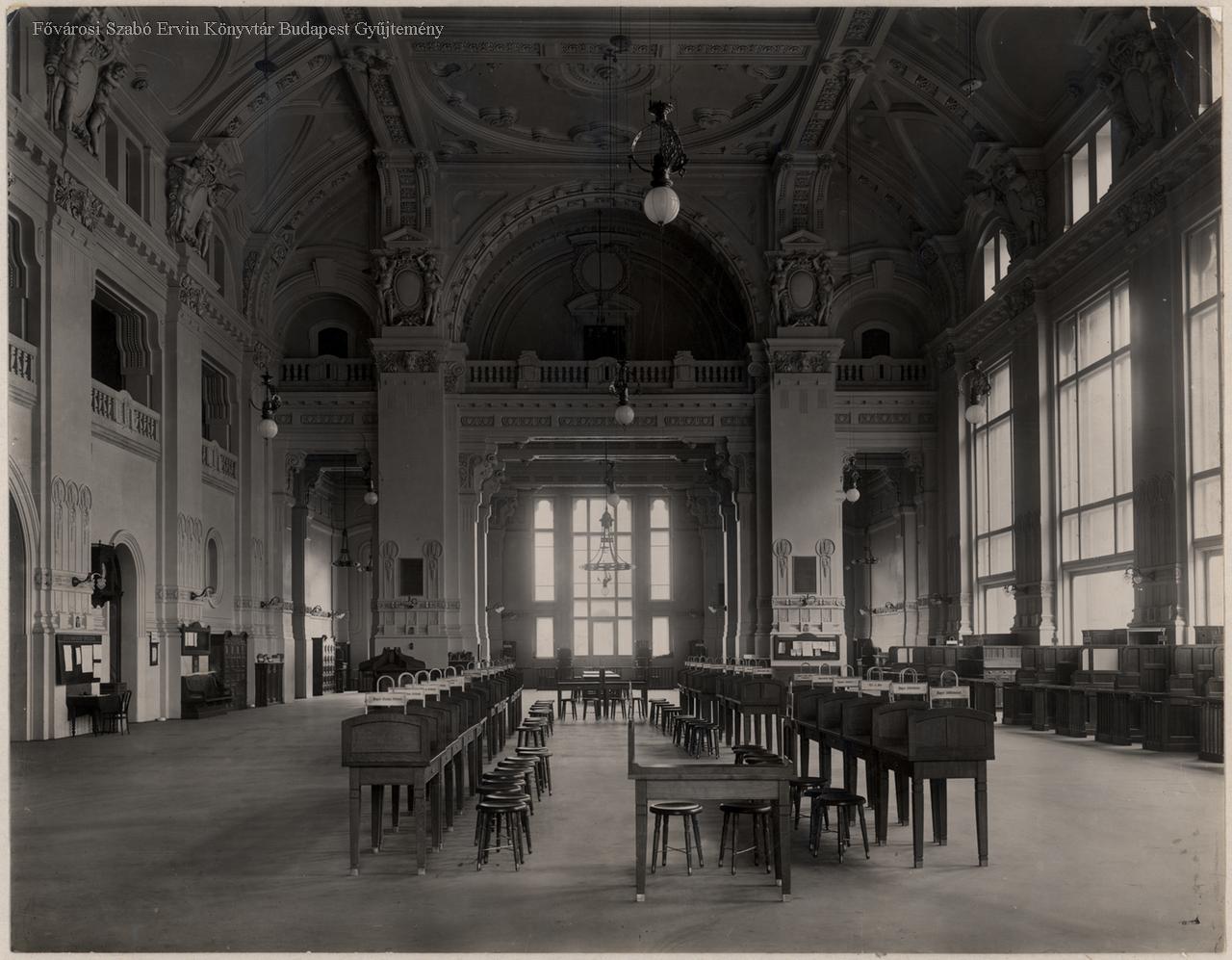 tőzsde, székház, bútor, lámpa, épületkép, belső felvétel, 1900-as évek
